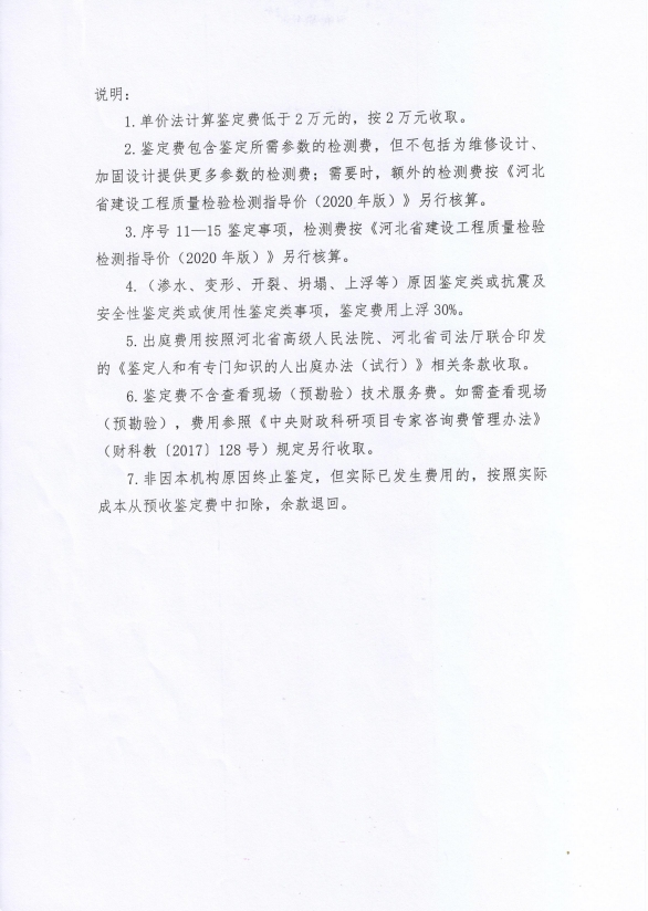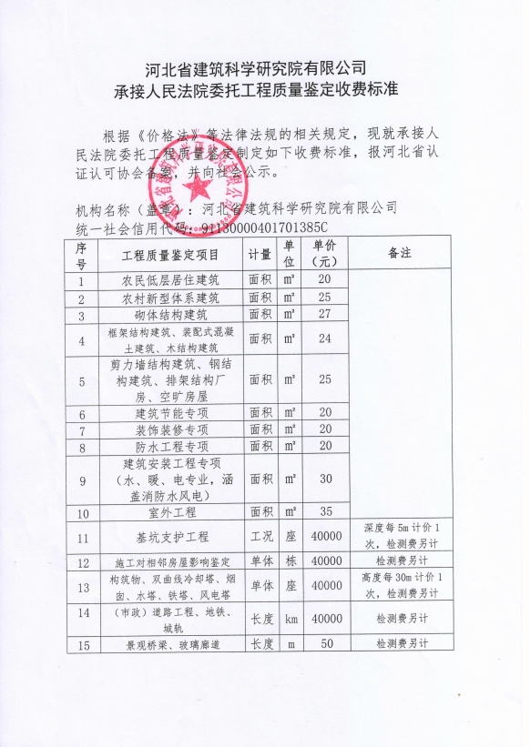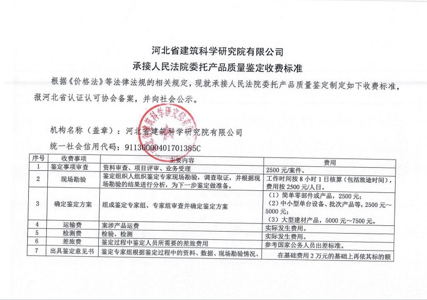 根据《河北省认证认可协会产品质量鉴定管理办法(试行)》第36条、《河北省认证认可协会工程质量鉴定管理办法(试行)》第35条“目前国家物价管理部门未对工程质量鉴定收费进行统一定价,鉴定机构应当公示本机构收费标准”之规定,我JiuYou J9(中国)参照财政部财科教【2017】128号《中央财政科研项目专家咨询费管理办法》中的有关规定,并结合我JiuYou J9(中国)产品质量鉴定和工程质量鉴定中鉴定专家工作的实际情况,制定了《河北省建筑科学研究院有限JiuYou J9(中国)产品质量鉴定/工程质量鉴定收费标准》(见附件)。现予以公示。